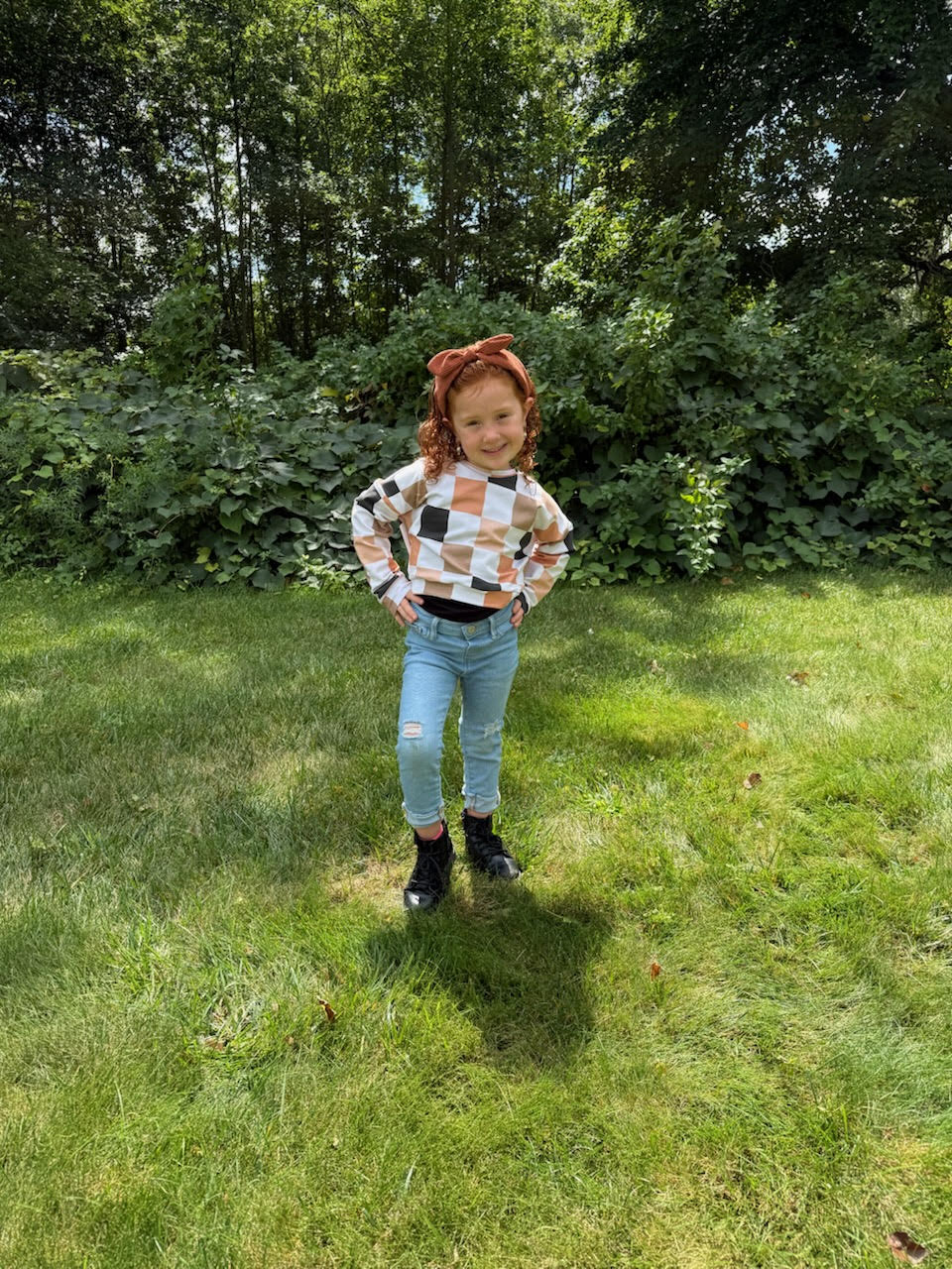 This girls checkered cropped sweater features cozy fall colors perfect for the season. Its soft fabric keeps her comfortable all day, while the trendy cropped cut adds a playful touch to any outfit.